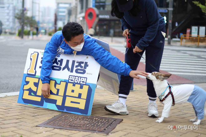 진석범 화성시장 예비후보가 유세중에 산책나운 반려견과 교감을 나누고 있다./제공 = 진석범 캠프