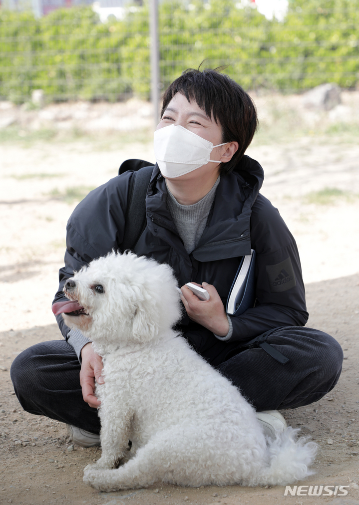 국민의힘 경기도지사 후보로 선출된 김은혜 의원이 24일 오후 수원광교호수공원 반려동물 놀이터를 찾아 반려동물 정책에 대한 시민들의 의견을 듣고 있다. (사진=김은혜의원실 제공)
