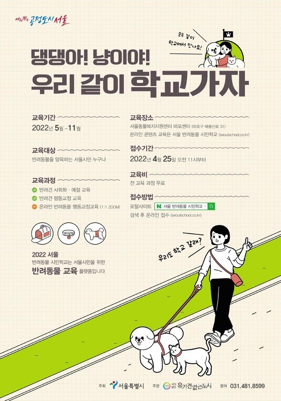서울시는 반려견의 예절 교육부터 반려묘·반려견의 문제행동 교정까지 맞춤형으로 받을 수 있는 '서울 반려동물 시민학교'를 5월부터 운영한다고 26일 밝혔다.
