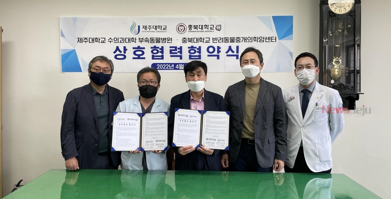 제주대학교 수의과대학 부속동물병원(원장 윤영민)과 충북대학교 수의과대학 반려동물중개의학암센터는 지난 19일 제주대에서 반려동물 중개의학 공동수행을 위한 업무협약을 맺었다.