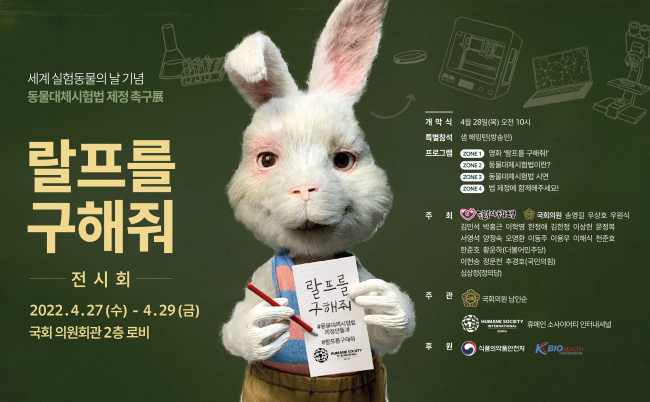 세계 실험동물의 날(4/24)을 맞아 동물대체시험법 제정을 촉구하는 ‘랄프를 구해줘’ 전시회가 27일 여의도 국회의원회관에서 개최된다.