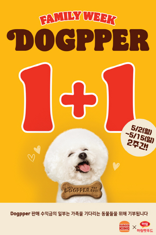 5월을 맞아 버거킹은 소중한 가족 구성원인 개린이들과 함께할 수 있는 ‘리얼 독퍼 1+1 프로모션’을 기획했다. 특히, 프로모션 수익금 일부는 동물보호단체에 기부할 예정이다. 프로모션 기간 동안 ‘리얼 독퍼’ 구매 시 1개를 추가로 증정받는 혜택과 함께 도움이 필요한 동물들에게 따뜻한 마음을 전하는데 동참할 수 있다.