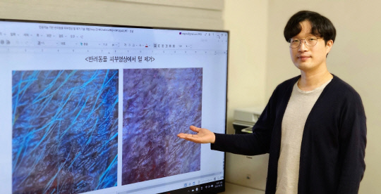 9일 유원상 선문대학교 교수가 연구실에서 '인공지능 기반의 반려동물 피부영상 털 제거 기술'을 설명하고 있다. 사진=윤평호 기자
