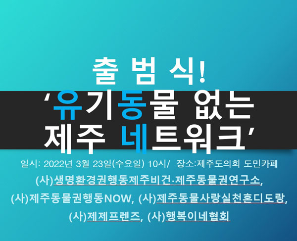 (사)생명환경권행동제주비건·제주동물권연구소, (사)제주동물권행동NOW, (사)제주동물사랑실천혼디도랑, (사)제제프렌즈, (사)행복이네협회 등은 23일 오전 10시 제주도의회 도민카페에서 '유기동물 없는 제주네트워크' 출범식을 갖는다.