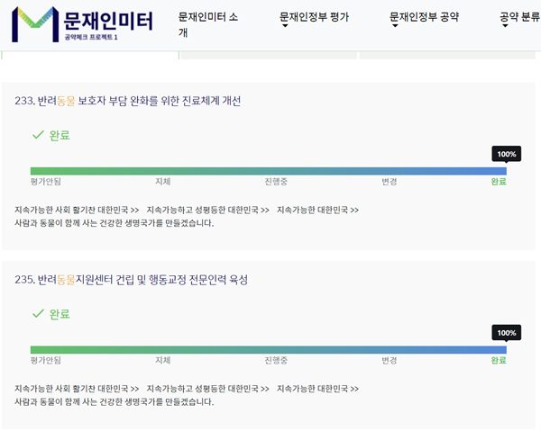 지난해 문재인미터는 문재인 정부의 <반려동물 보호자 부담 완화를 위한 진료체계 개선> 공약을 진행 중(50%)으로 평가했었다. 그런데 올해 5월 3일 평가에서 100% 완료했다고 판단했다.
