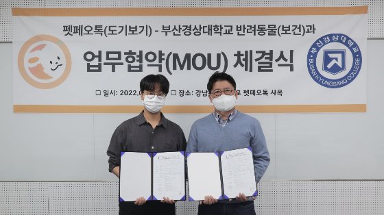권륜환 펫페오톡 대표(사진 왼쪽)와 김병석 부산경상대 반려동물학과 교수가 산학협력 MOU를 맺고 기념촬영 중이다/사진제공=펫페오톡