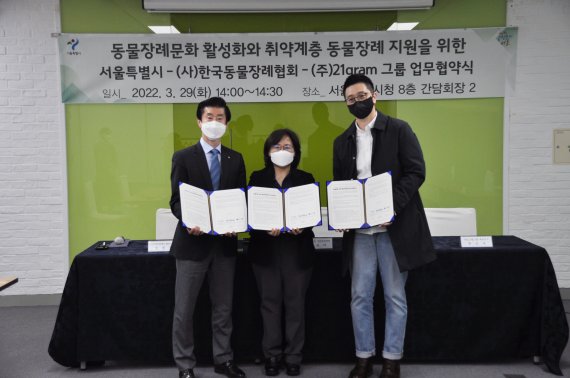서울시는 지난 29일 한국동물장례협회, 21그램그룹과 함께 '생명존중 문화 함양과 동물 장례문화 활성화 업무협약'을 체결하고 오는 5월부터 2년간 '저소득층 시민 대상 반려동물 장례'를 지원한다고 30일 밝혔다.