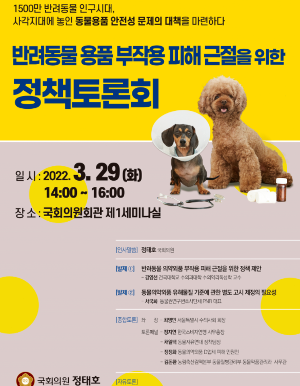 ▲'반려동물 용품 부작용 피해 근절 위한 정책토론회' 포스터. 사진=정태호 국회의원실 제공