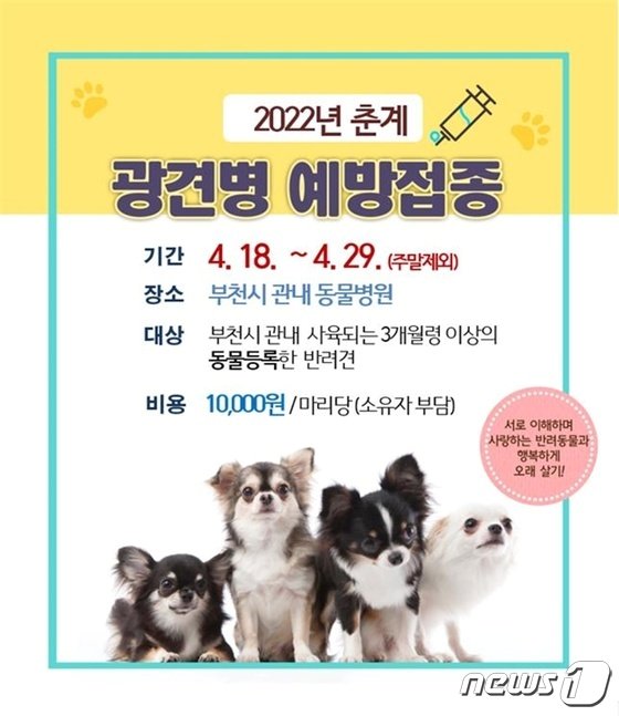 경기 부천시는 18일부터 29일까지 관내 동물병원 65곳에서 '춘계 광견병 예방접종'을 실시한다고 5일 밝혔다.