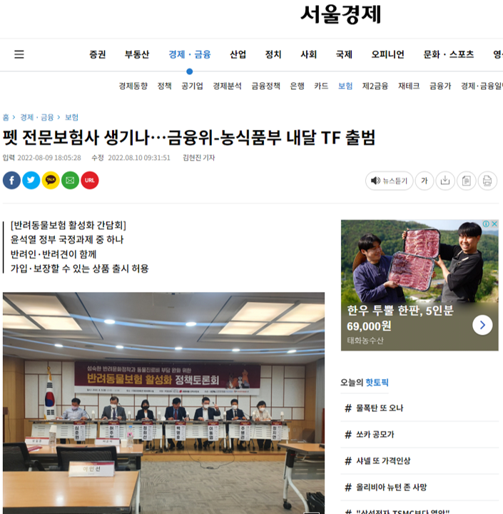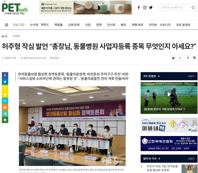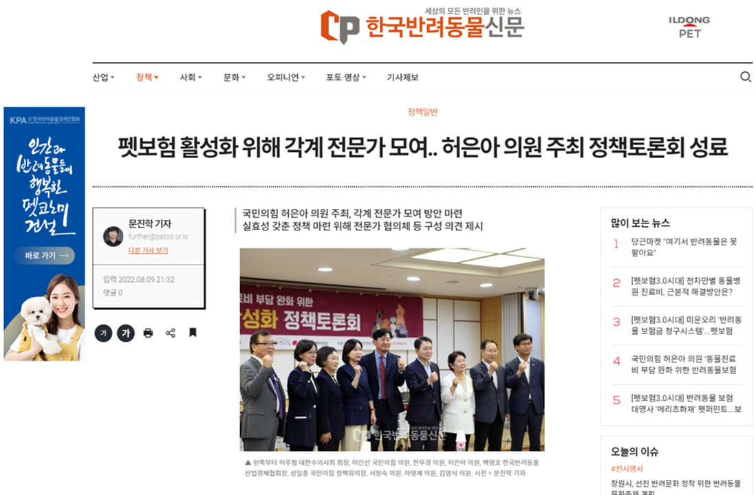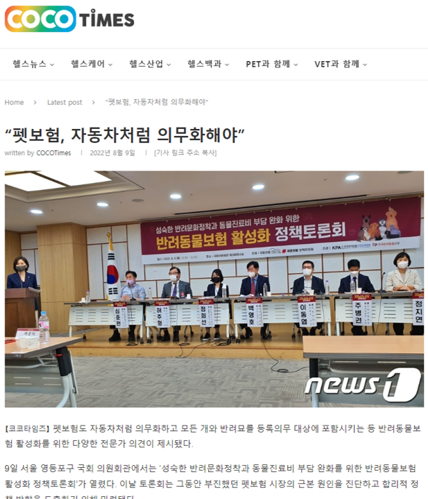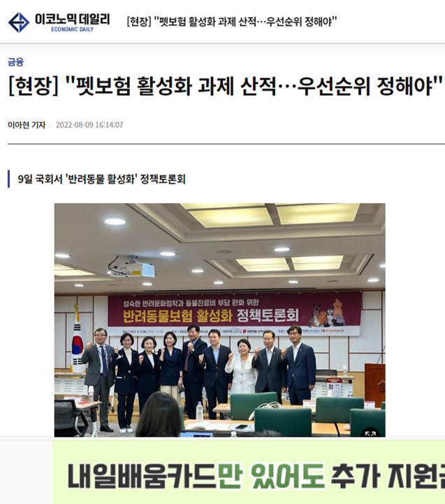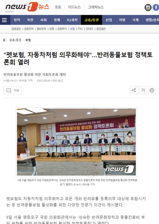 <국회정책토론회 관련기사 모음>성숙한 반려문화정착과 동물진료비 부담 완화 위한 반려동물보험 활성화 정책토론회