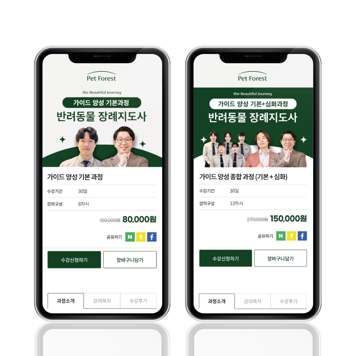 펫포레스트 교육센터 런칭과 함께 ‘가이드 양성 기본 과정'과 ‘가이드 양성 심화 과정', 그리고 두 과정을 합친 ‘가이드 양성 종합 과정'을 공개했다. 반려동물 장례지도사를 반려동물과 보호자가 함께 지내며 이후 이별까지의 여정을 안내하는 가이드로 소개하며 직업 소개부터 이후 실무 노하우까지 강의에서 학습할 수 있다.