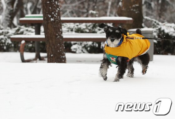 서울 용산구 효창공원에서 강아지가 눈 쌓인 공원을 산책하고 있다. 2022.12.21/뉴스1 © News1 김민지 기자