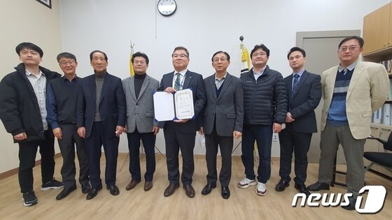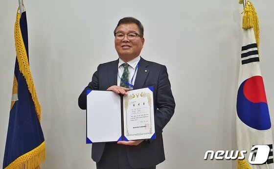 제27대 대한수의사회 회장에 당선된 허주형 후보가 13일 경기 성남시 수의과학회관에서 당선증을 수령 받고 사진을 찍고 있다. © 뉴스1 최서윤 기자