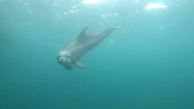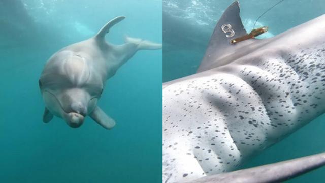 방류를 앞두고 훈련 중인 비봉이. 등지느러미에 8번을 새긴 비봉이의 몸이 말라 있다. 해양수산부 영상 캡처