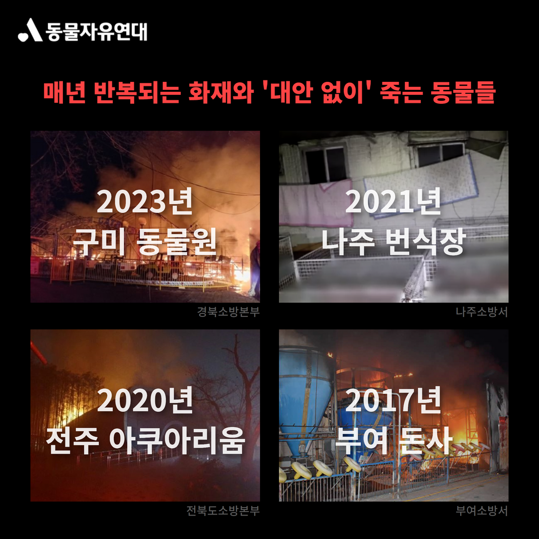 올해, 구미의 한 놀이공원 동물전시관에서 화재가 발생해 토끼, 앵무새 등 100여 개체가 죽는 마음 아픈 사건이 있었습니다. 2021년에는 나주 개 번식장에 화재가 생겨 개 100여 개체가 타 죽었고, 2020년에는 전주동물원 아쿠아리움에서 불이 나 20여 종의 어류 1백여 개체가 죽었습니다. 농장동물이 사는 축사에서 발생하는 화재는 건수를 일일이 세기도 어려울 만큼 빈번한 횟수로 일어나며, 그 화재로 수많은 동물이 죽어왔습니다. 이처럼 동물원 및 동물 관련 시설 화재는 한해도 빠지지 않고 반복적으로 발생해, 많은 동물의 목숨을 빼앗고 있습니다.