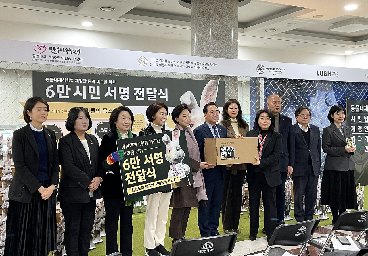 [한국농어촌방송=조수아 인턴기자] '검은 토끼의 해'를 맞아 실험동물의 희생을 최소화하기 위해 마련된 동물대체시험법 제정안 통과를 위한 6만 서명 전달식이 31일 개최됐습니다.