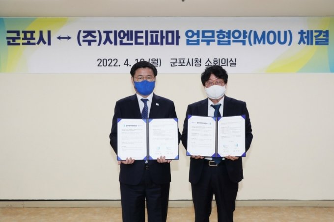 경기 군포시가 18일 뇌신경질환 치료제 연구개발 바이오 벤처기업인 지엔티파마(GNT Pharma)와 반려동물 바이오 신약연구소 건립을 위한 업무협약을 체결했다.